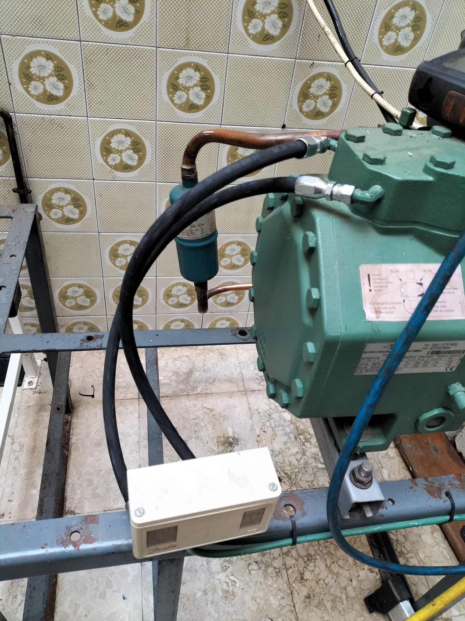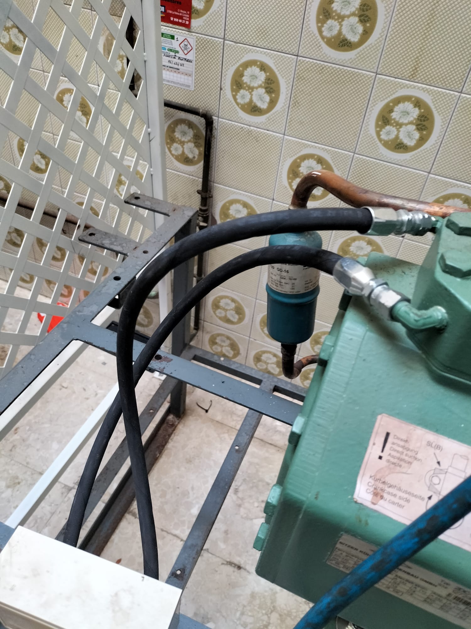 Sustitución de latiguillos de alta y baja en unidad condensadora de cámara de congelados en confitería